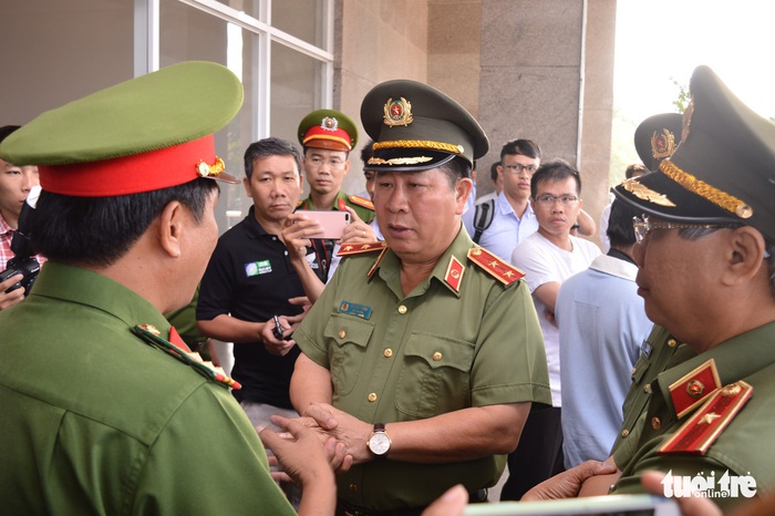 Thứ trưởng Bộ công an Bùi Văn Thành trao đổi với Thượng tá Nguyễn Thanh Hưởng - quyền giám đốc Cảnh sát PCCC TP.HCM về vụ cháy - Ảnh: XUÂN HƯNG